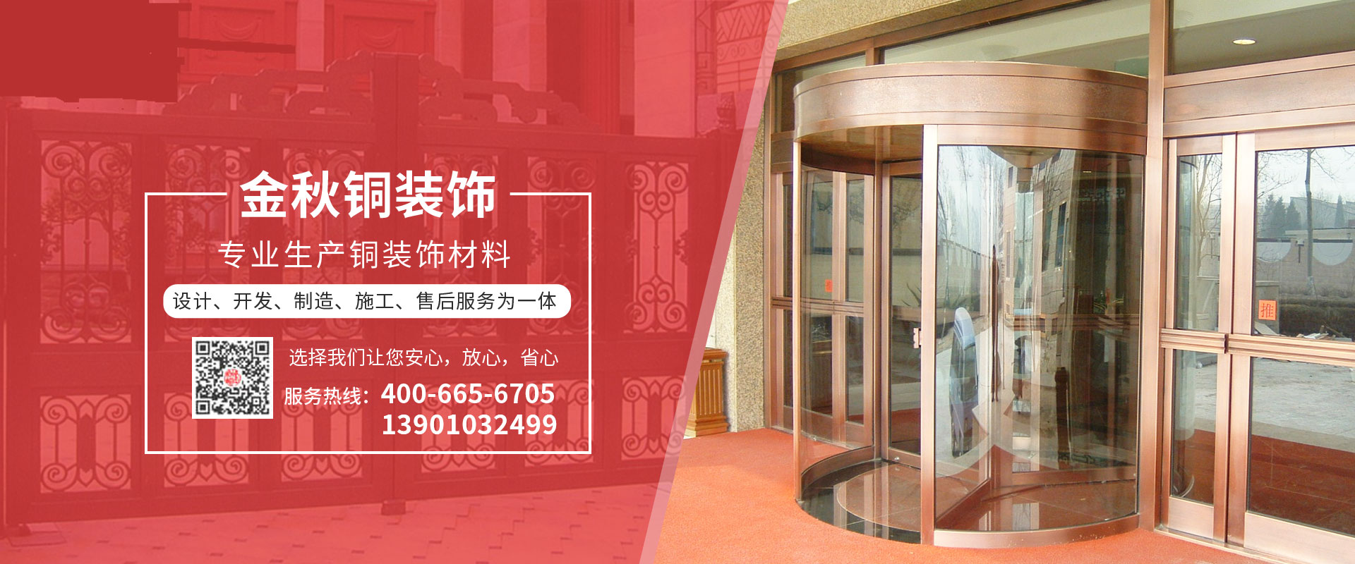 北京金秋銅裝飾材料有限公司是專業(yè)生產(chǎn)銅裝飾材料及設(shè)計、開發(fā)、制造、施工、售后服務(wù)為一體的大型綜合企業(yè)??沙薪咏ㄖ~裝飾工程及五星級酒店、別墅、博物館、樓樘管所等高檔銅裝飾項目;生產(chǎn)各種規(guī)格的旋轉(zhuǎn)門、平滑門、別墅門、電控門、工藝門、旋轉(zhuǎn)護(hù)欄、屋頂銅飾防水瓦、浮雕壁畫......